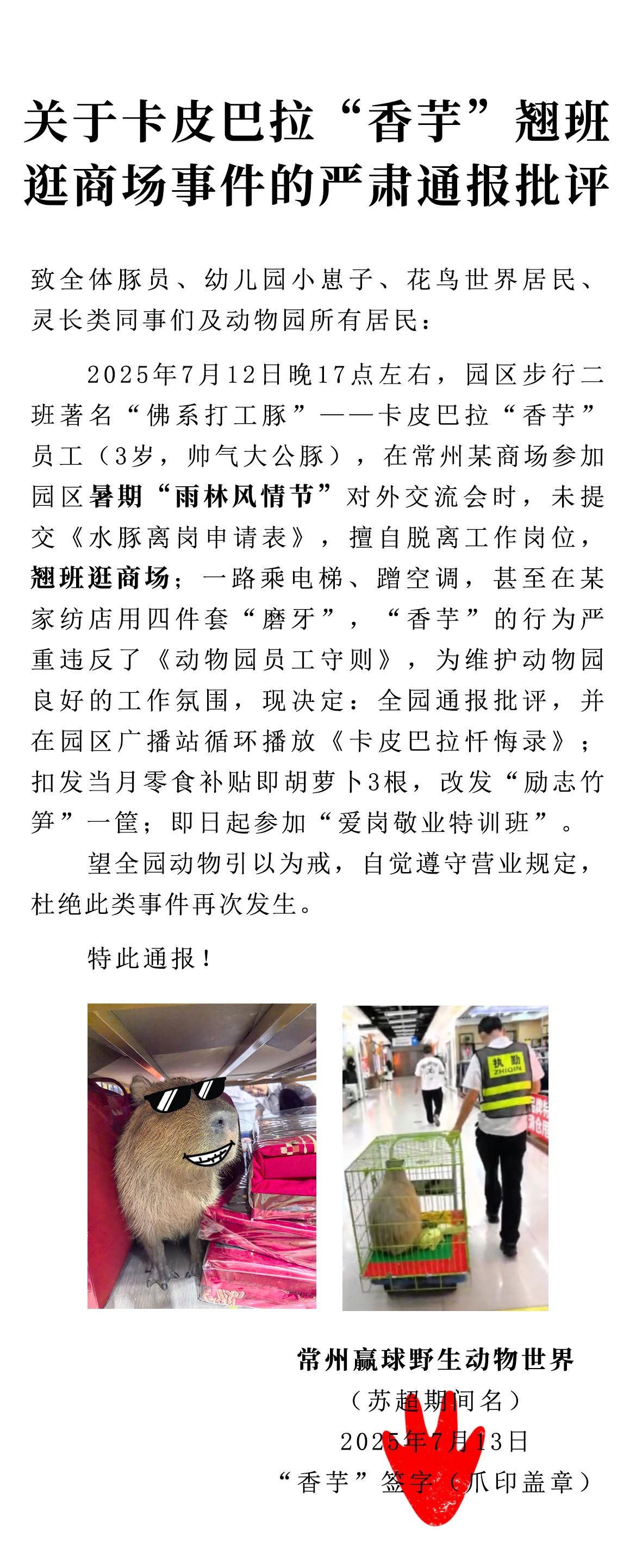通报批评!赢球动物园卡皮巴拉“香芋”翘班逛商场