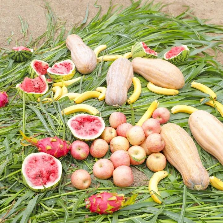 摆上苹果、南瓜、香蕉、西瓜等美食