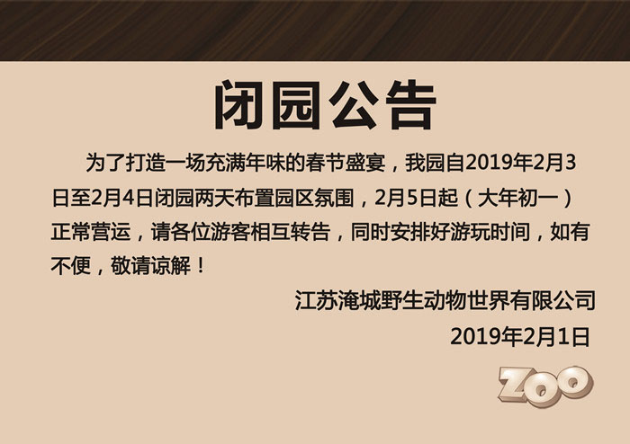 为打造一场充满年味的春节盛宴,我园自2019年2月3日至2月4日闭园两天布置园区氛围,2月5日起(大年初一)正常营运,请各位游客相互转告,同时安排好游玩时间,如有不便,敬请谅解!