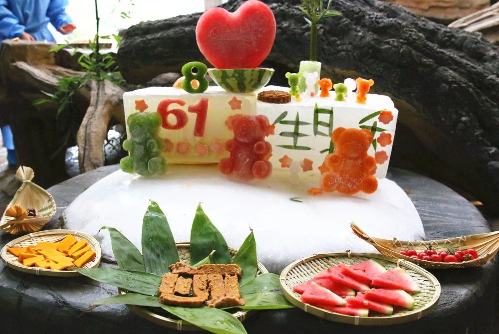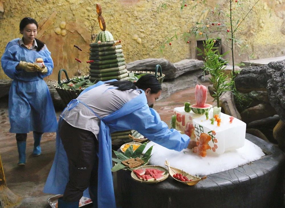 一早,饲养员忙碌布置庆生现场