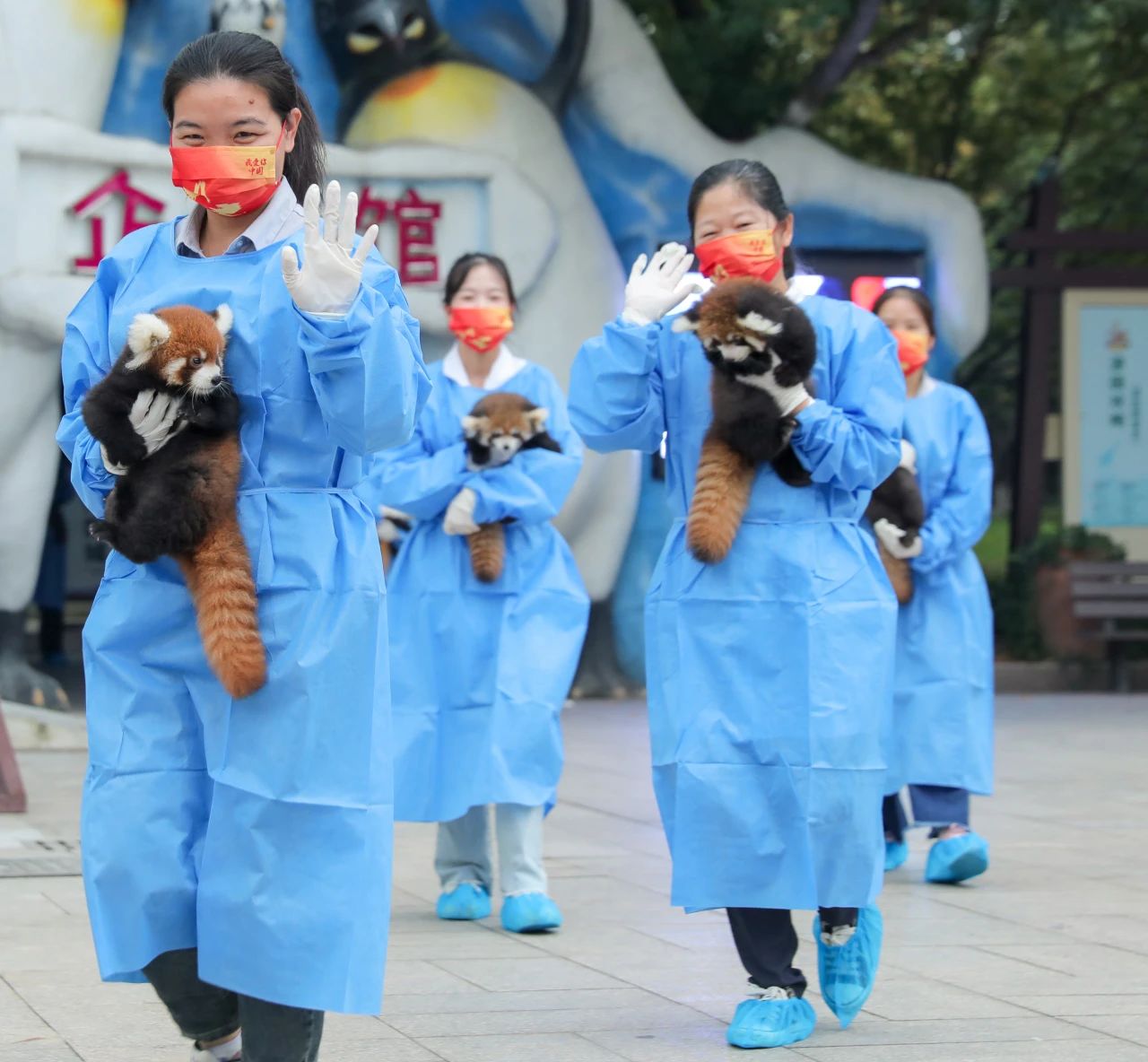 只见10位饲养员人手一只红熊猫宝宝,他们依次排开,红熊猫宝宝对着镜头或张牙舞爪,或做鬼脸,或卖萌,甚是可爱。据了解,红熊猫是先于大熊猫被发现叫“熊猫”这个名字的,后来大熊猫被发现后才改叫“小熊猫”、“红熊猫”,红熊猫全身呈红棕色,凭借其超高的颜值和萌萌的外表斩获了不少的粉丝,而且红熊猫的人工繁育难度一点也不亚于大熊猫,作为国家二级保护动物,濒危等级甚至高于国宝大熊猫!